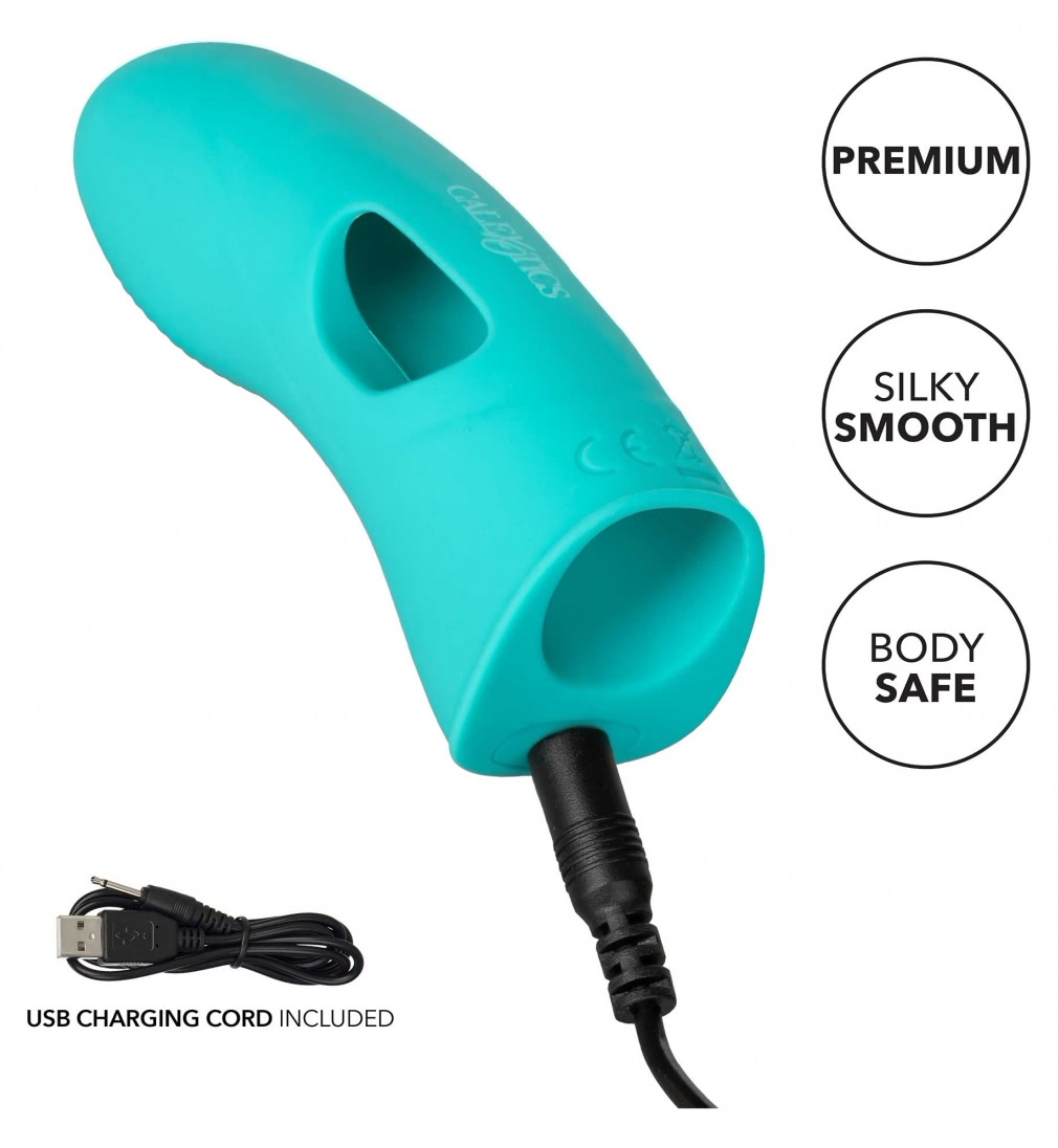 Lungime Totală: 10 cm Lungime Inserabilă: 8 cm Diametru: 3.25 cm Culoare: Turcoaz Material: Silicon Brand: CalExotics Are acumulator cu Lithium Ion Are vibrații Sigur pentru corp 10 tipuri de vibrații Bateriile sunt incluse Rezistent La Apă Reîncărcabil Încărcare Prin USB