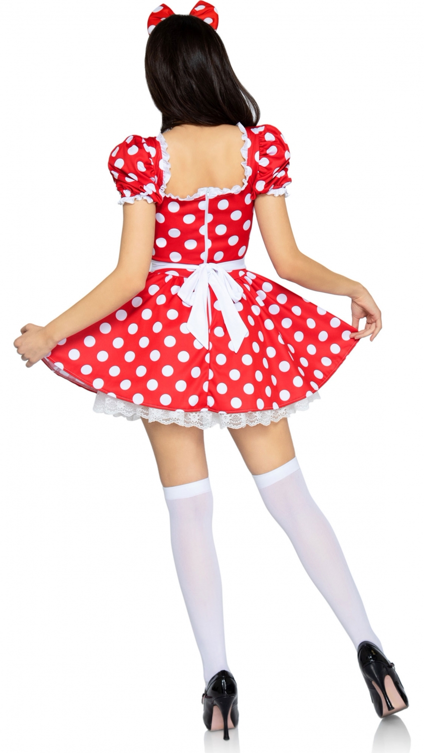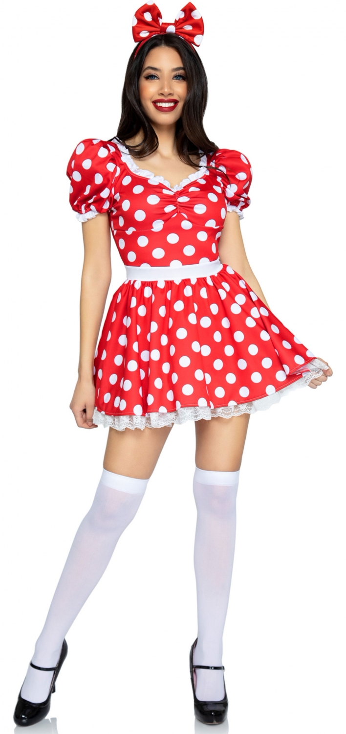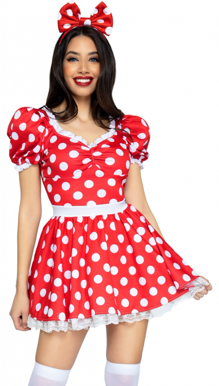 Rochie cu buline din 2 piese, cu corset tip inimă cu volane și bentiță cu fundă asortată. Dresurile din imagini pot fi comandate separat.