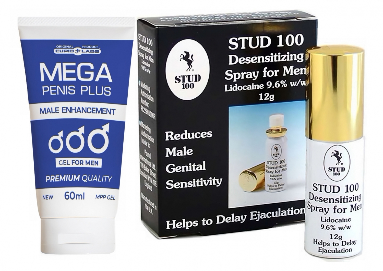 Pachet avantajos cu preț diminuat compus din Atomizator Stud 100 Autentic Întârziere Ejaculare 12g și Gel Mărire Mădular Mega Penis Plus 65ml.