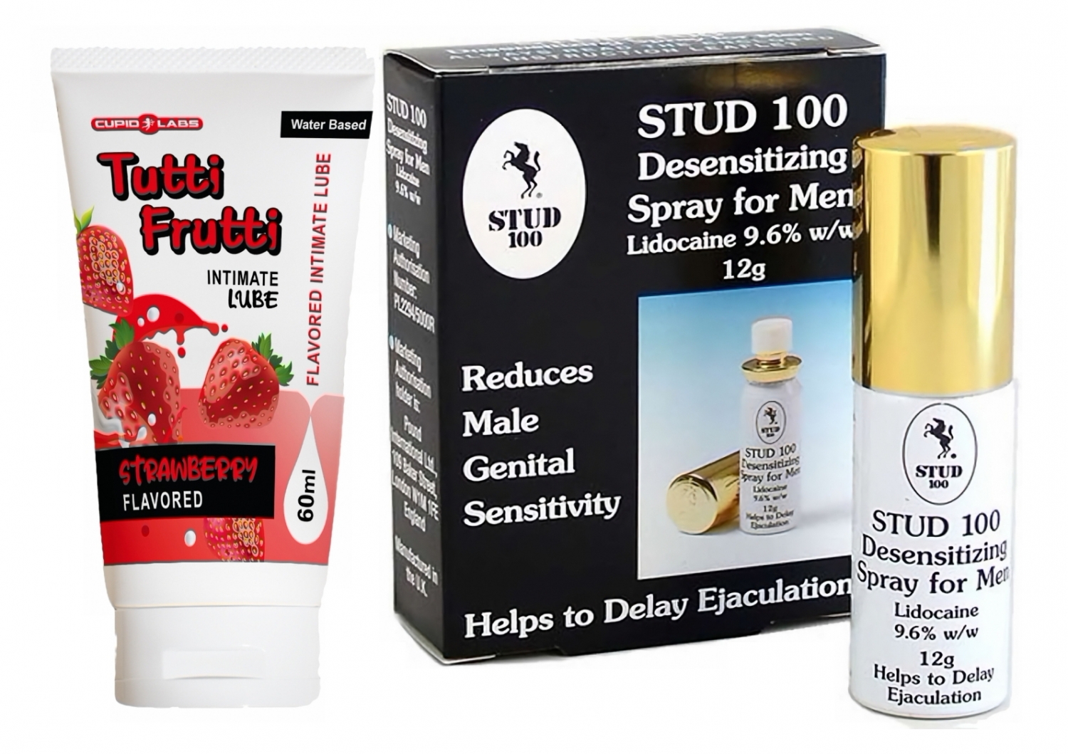 Stud 100 este cel mai bine vândut spray contra ejaculării precoce, prelungind astfel durata actului sexual. Tutti Frutti căpșună este un material lubrifiere pe bază de apă cu mireasmă căpșună. Este potrivit atât pentru sex genital cât și pentru anal. Produsul are consecință hidratant și analgezic.