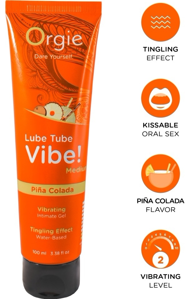Gel intim comestibil Orgie Vibe Pina Colada, pe bază de apă, cu aromă tropicală de ananas și nucă de cocos. Textura mătăsoasă și non-adezivă asigură alunecare firească și confort la aplicare. Efectul de furnicături și vibrație ușoară (nivel 2/10) se resimte la câteva secunde după aplicare; produsul poate fi reaplicat după nevoie.