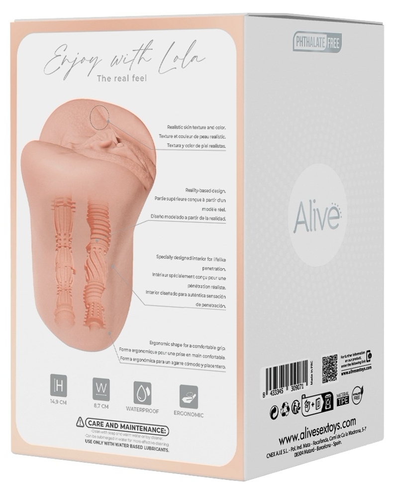 Alive Lola este un masturbator compact și discret, proiectat pentru utilizare primitoare și întreținere simplă. Carcasa ergonomică se potrivește bine în palmă, punând la dispoziție control stabil la manevrare.