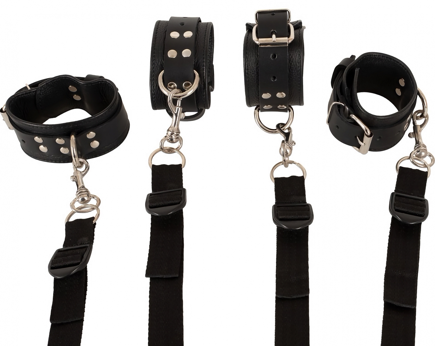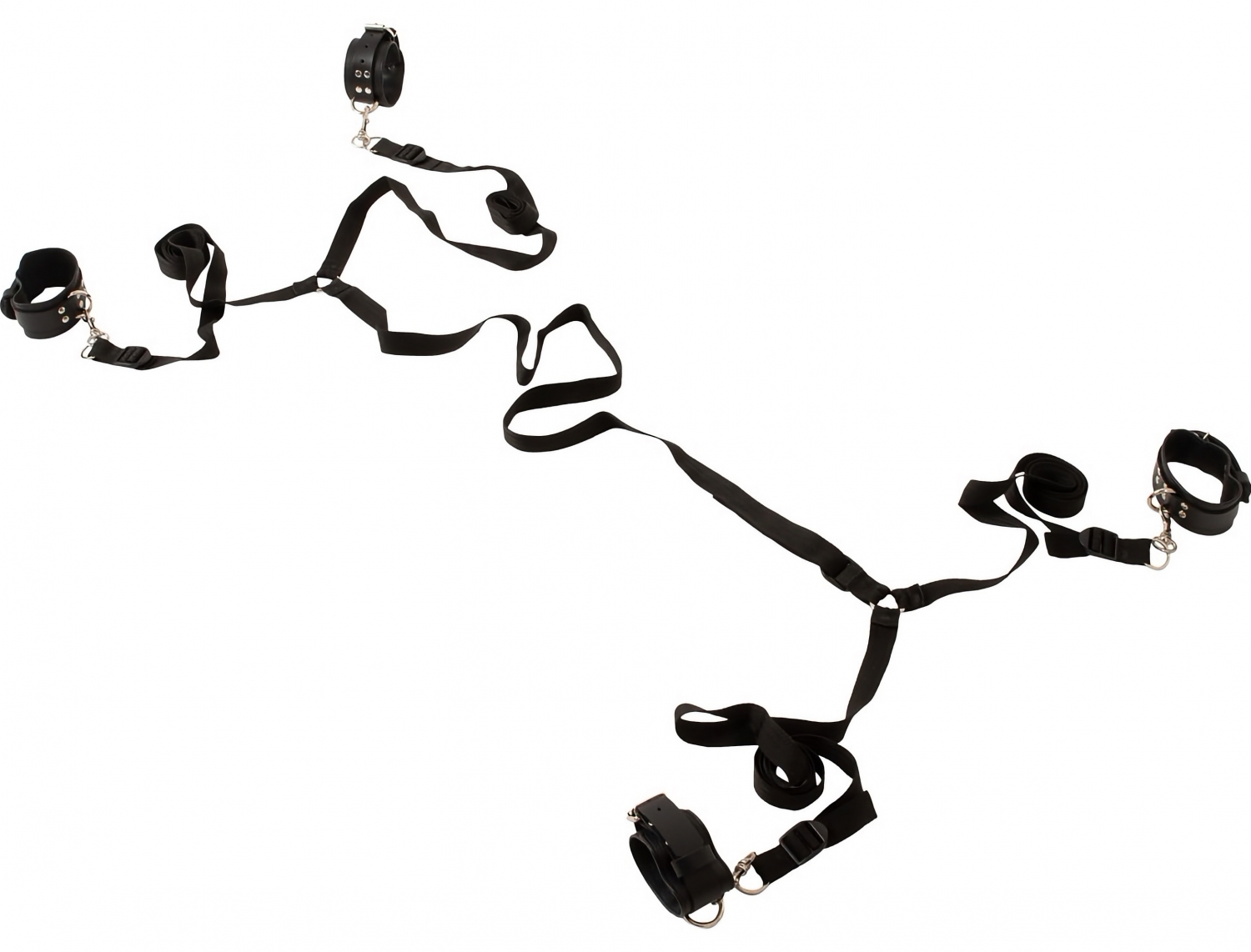 Dimensiuni și materiale: curea centrală 125 cm; patru cingătoare laterale a câte 130 cm. Cătușe pentru mâini: 21–28 cm; cătușe pentru glezne: 26–33 cm. Materiale: piele naturală, metal și 100% polipropilenă pentru curele.