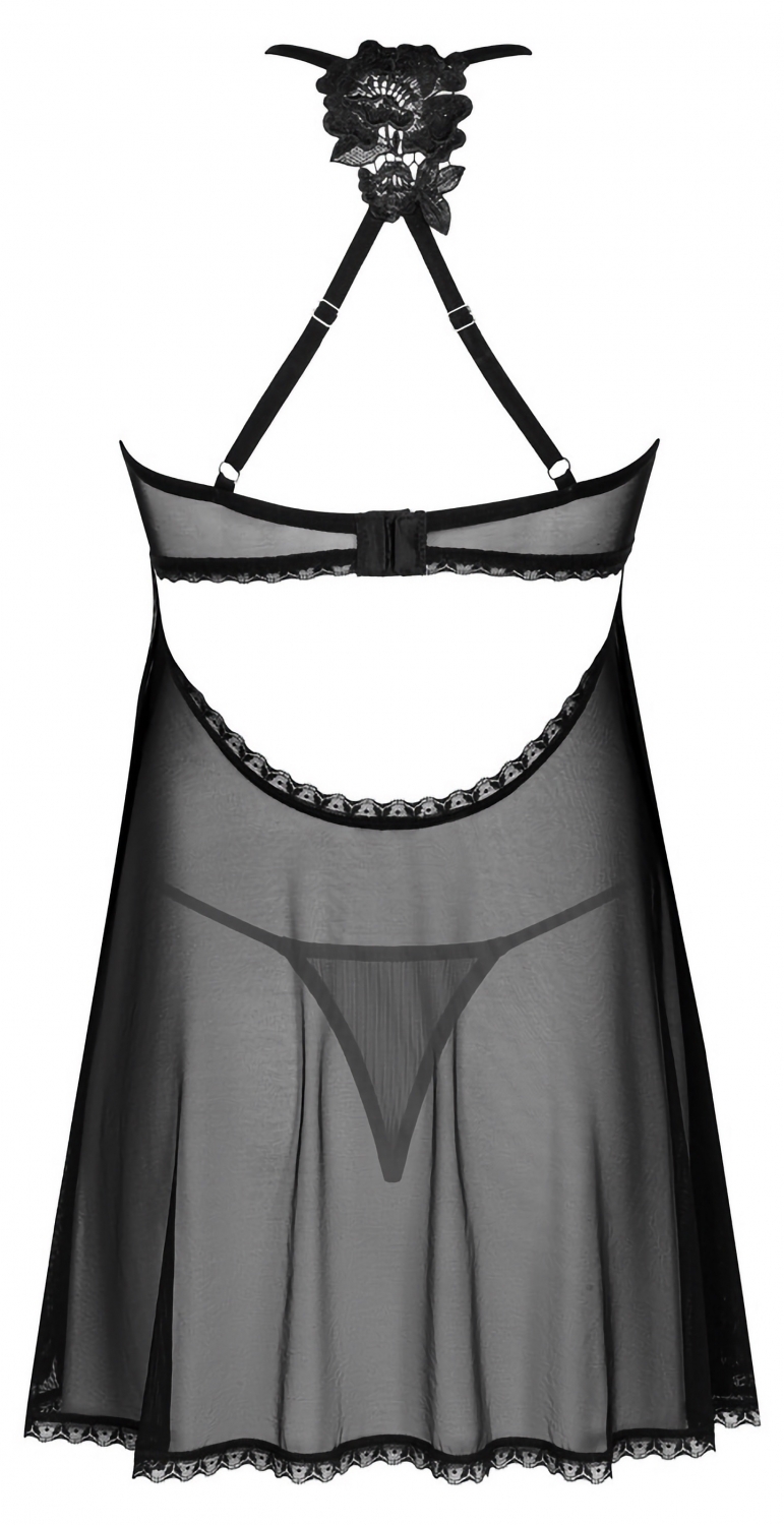 Descoperiți setul Latinesa de la Obsessive. Baby doll scurt, evazat, în nuanțe de negru, cu zone semi-transparente, zămislit din elemente ușoare și elastice pentru libertate de mișcare. Conține tanga asortată. Ornamentul tip bijuterie la decolteu completează un accent discret, iar bretelele reglabile, încrucișate la spate, sunt decorate cu broderii fine.