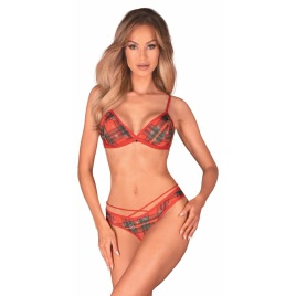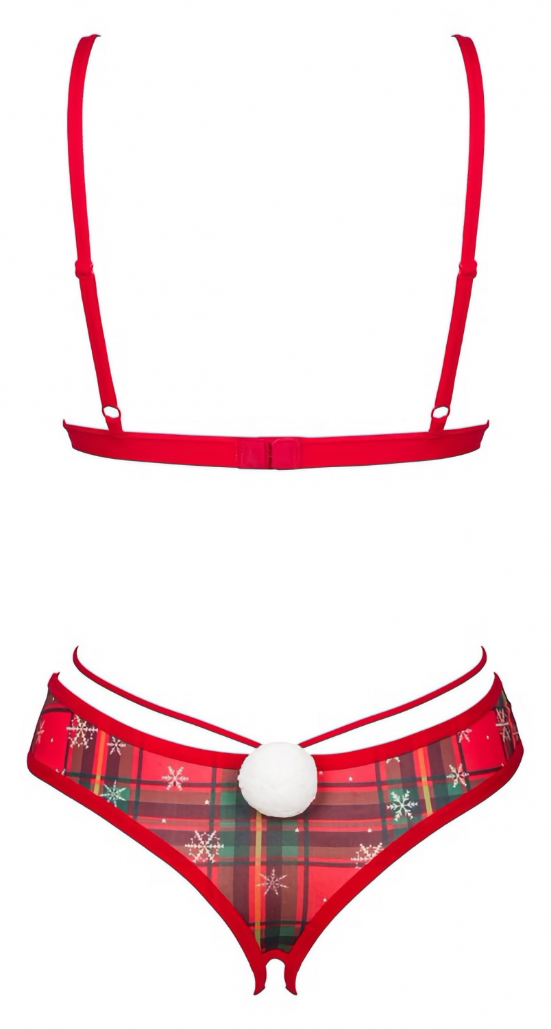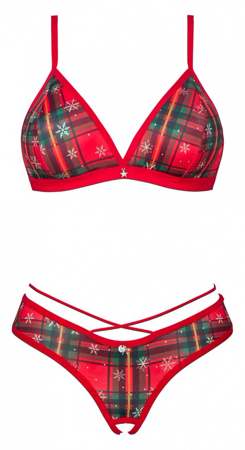 Setul Ms. Merrilo de la Obsessive aduce o notă rafinată sezonului rece, păstrând liniile discrete și luxul pe primul plan. Include sutien fără armătură și chilot decupat, ambele din tulle elastic cu model în carouri și aplicații de fulgi albi.