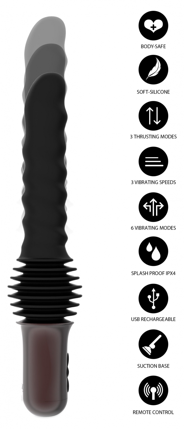Mecanismul furnizează o cursă de împingere de până la 5 cm, cu 3 ritmuri diferite, iar vibrațiile includ 9 moduri distincte. Baza cu ventuză reglabilă aduce stabilitate și utilizare hands-free pe suprafețe netede. Controlul se face facil prin telecomandă, iar designul robust la apă permite utilizare în medii umede. Materialul finit este reîncărcabil, eliminând dependența de baterii de unică folosință.