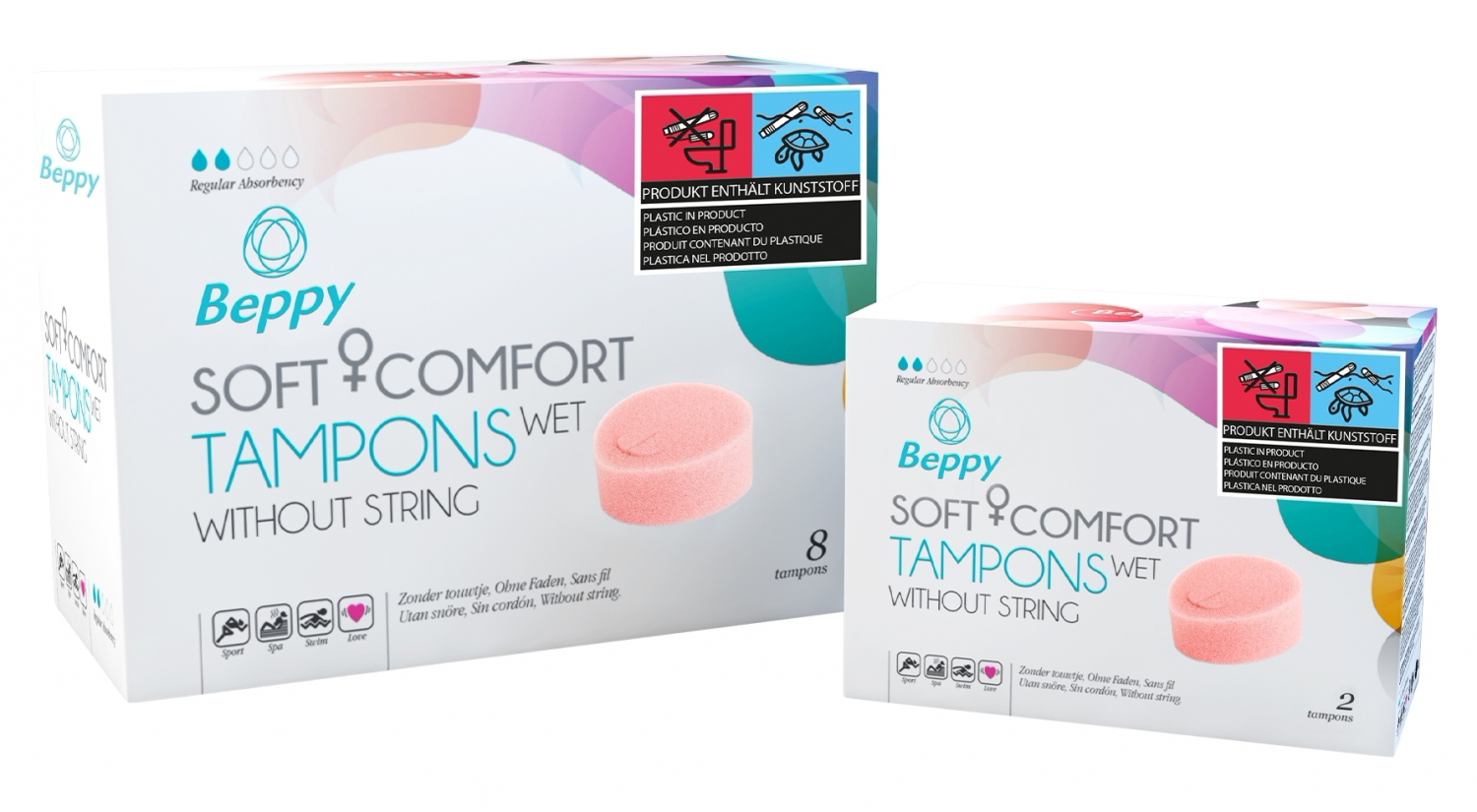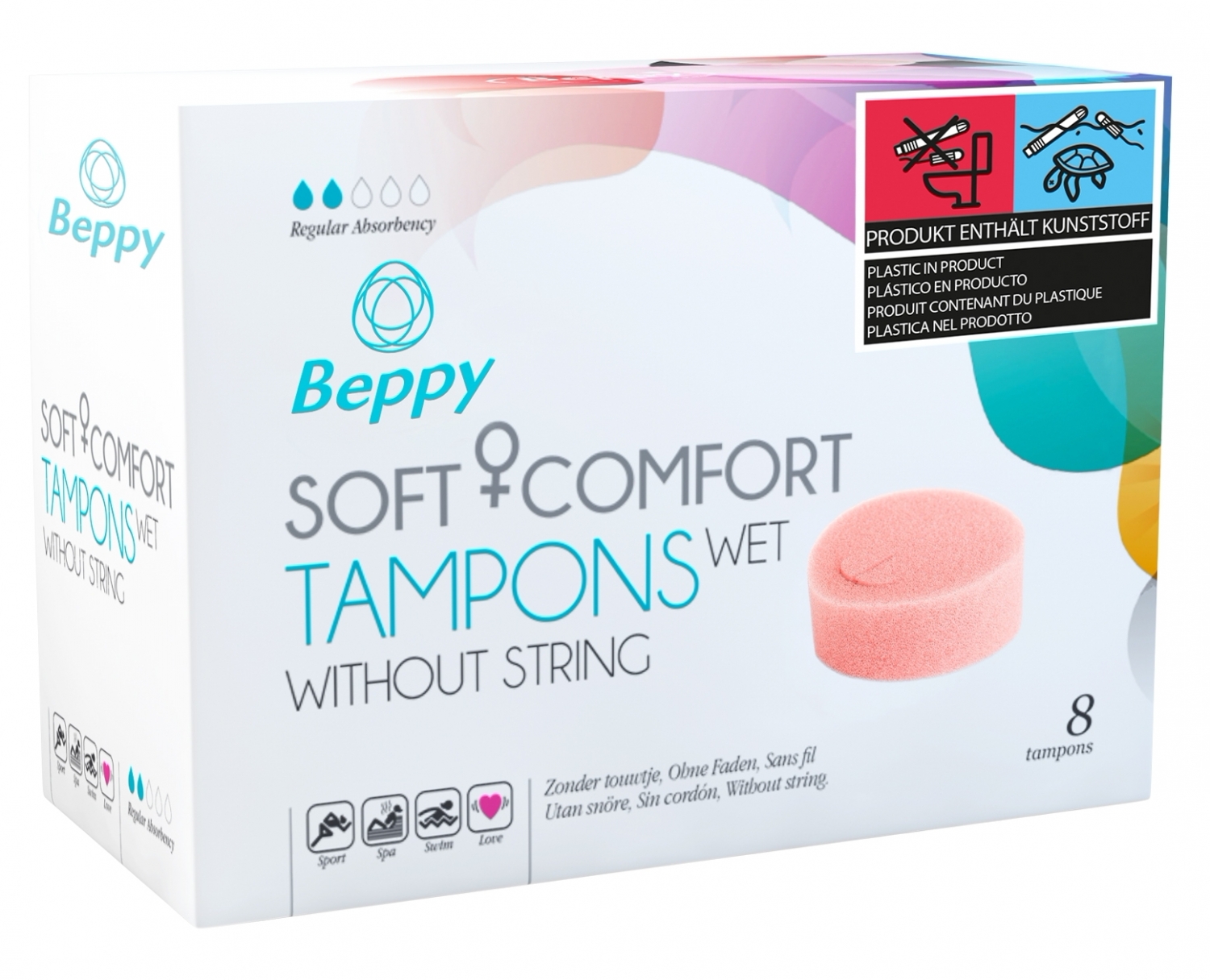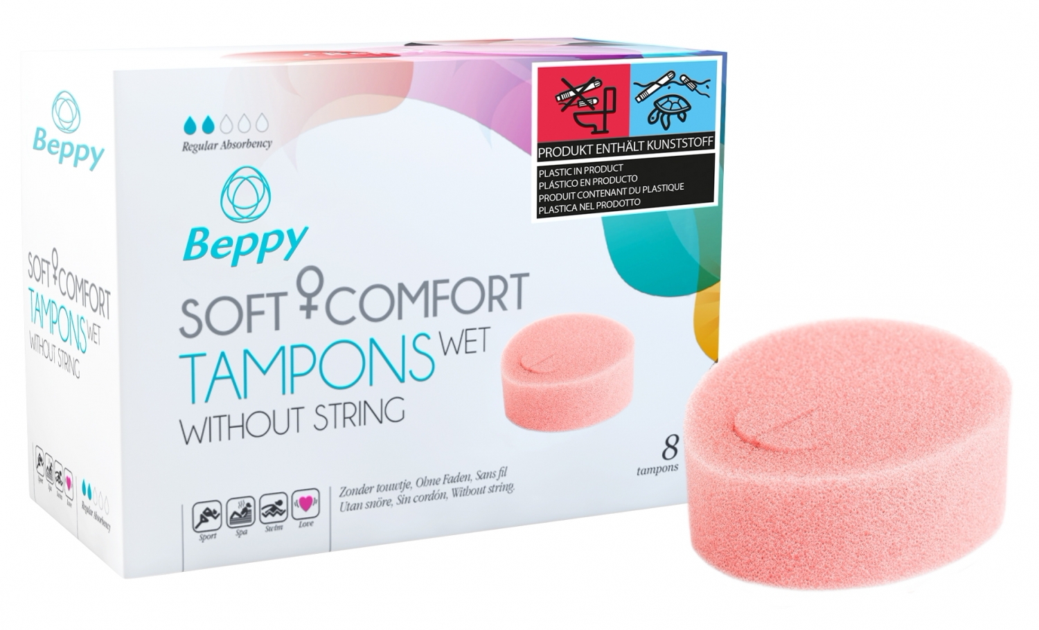 Beppy Soft Comfort Wet sunt tampoane sub configurație de burete moale și flexibil, umezite cu lacta-gel pentru o introducere mai facilă și confort pe durata purtării. Transmite protecție invizibilă până la 8 ore în zilele cu flux.