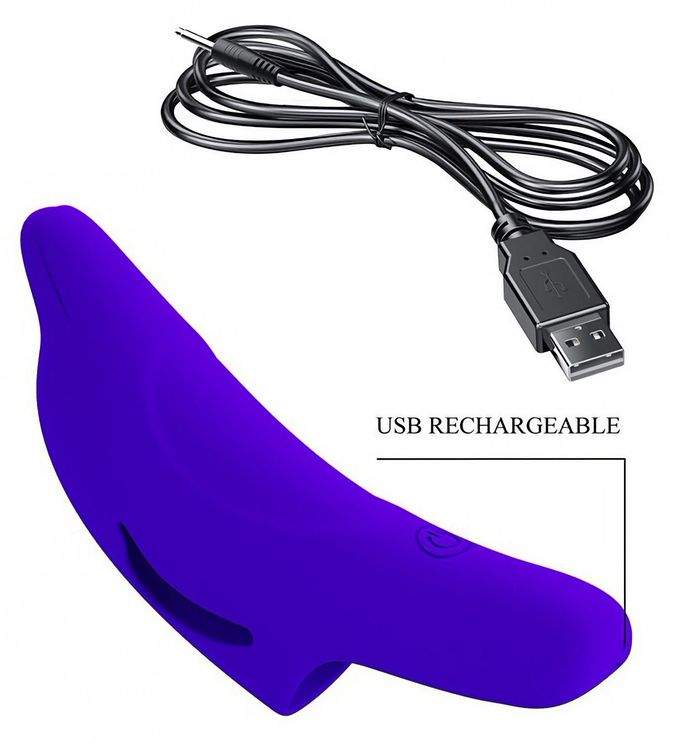 Delphini de la Pretty Love este un vibrator de deget slip-on din silicon catifelat, zămislit pentru stârnire precisă și manevrare ușoară. Se modelează confortabil pe deget și oferă un contact direct prin vârful înclinat și texturat.