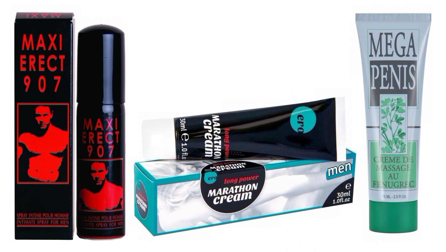 - Cremă Marathon (30 ml): formula cu compoziție care ameliorează microcirculația (ginkgo, cayenne, benzil nicotinat, camfor) ajută la salvgardarea erecției mai mult timp; textura intră ușor în epidermă — aplică o cantitate mică, masează și așteaptă câteva minute înainte de contact. Recomandată aplicarea în combinație cu prezervativ pentru confort sporit.
