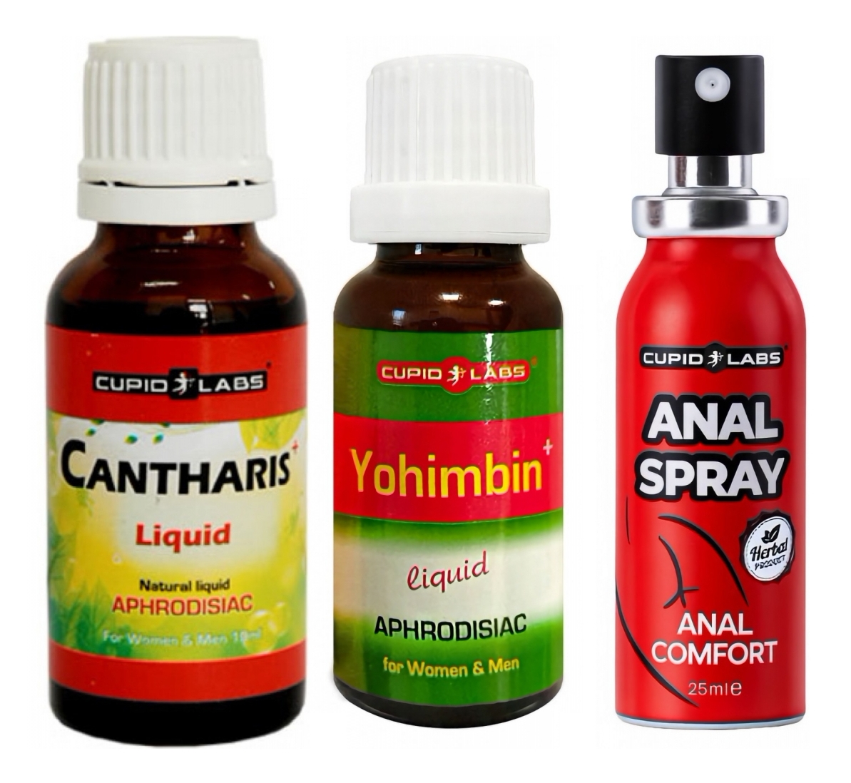 Detalii utile despre conținut: Cantharis Plus și Yohimbin Drops sunt formule pe bază de extracte naturale, gândite pentru masculi și femei, ambalate în flacoane practice de 20 ml; furnizează un boost rapid al apetitului și al energiei. Sprayul anal Cupid Labs, 25 ml, are efect local de relaxare și este gândit pentru întrebuințare punctuală când doriți să eliminați disconfortul.
