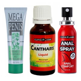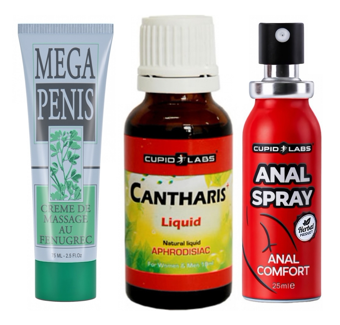 Cum le folosiţi împreună: administraţi Picăturile Cantharis Plus (20 ml, Cupid Labs) cu 30 de minute înainte de întâlnire — 10–15 picături în indiferent ce băutură sau sub limbă; nu mai mult de două sesiuni în 24 h. În timpul preludiului folosiţi Cremă Mărire Mega Penis (75 ml, Ruf) pentru un frecție tonic al glandului și al tijei (aplicaţi pe dermă sănătoasă, evitaţi glandul, masaţi până la absorbţie); crema îmbunătăţeşte circulaţia şi conferă fermitate. La momentul penetrării anale, aplicaţi Sprayul Desensibilizator Anal (25 ml, Cupid Labs) local, câteva pulverizări, pentru recreere şi reducerea disconfortului. În combinaţie, dropsurile amplifică dorinţa, crema oferă încredere fizică, iar sprayul schimbă experienţa anogenitală în una mai blândă.
