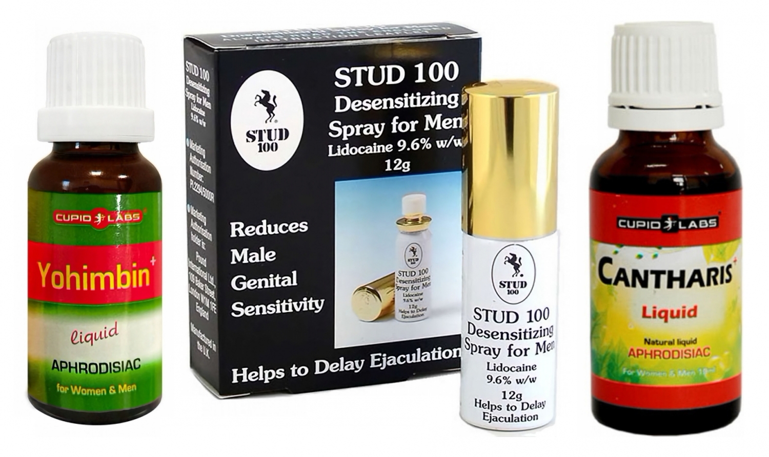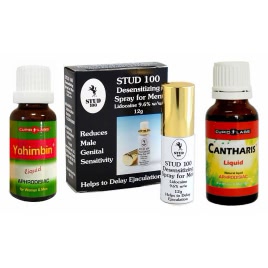 Cum se folosesc împreună: administrați picăturile afrodiziace cu aproximativ 30 de minute înaintea întâlnirii intime (Cantharis 10–15 picături în băutură sau sub limbă; Yohimbin 15–20 picături dizolvate în apă). Acestea măresc apetitul sexual, vigoarea și sensibilitatea emoțională. La finalul preludiului, întrebuințați sprayul topic local pe gland și, dacă doriți, pe mărimea penisului (2–4 pulverizări recomandate), așteptați 5–10 minute, apoi clătiți sau folosiți prezervativ. Această succesiune păstrează dorința crescută în timp ce amânați punctul culminant.