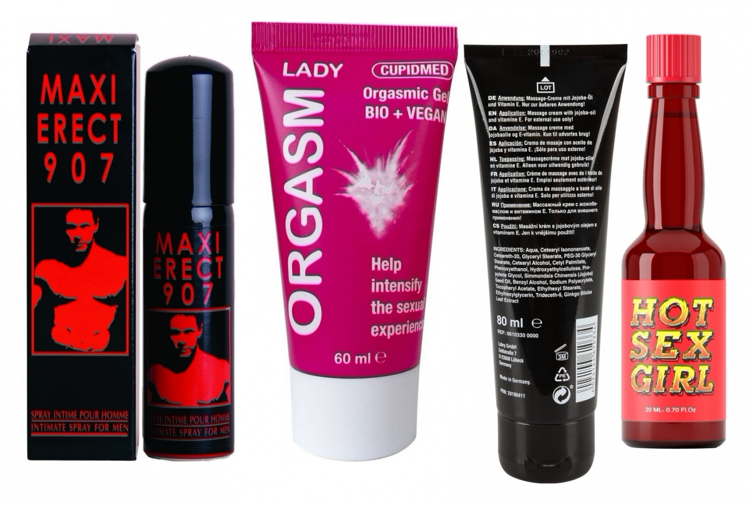 Detalii utile: Gelul este hipoalergenic, fără parfum și compatibil cu alte produse; crema conține ulei de jojoba, vitamina E și extras de ginkgo pentru hrănire, ajutorul circulației și îngrijirea pielii; picăturile și spray-ul folosesc compoziție naturale vestite pentru proprietățile lor tonifiante. Folosiți-le în formulă pentru un preludiu creativ: crema + atingeri senzuale, apoi gelul și picăturile pentru ea, spray-ul pentru el cândva de act — astfel obțineți mai multă intensitate, lubrifiere și control.
