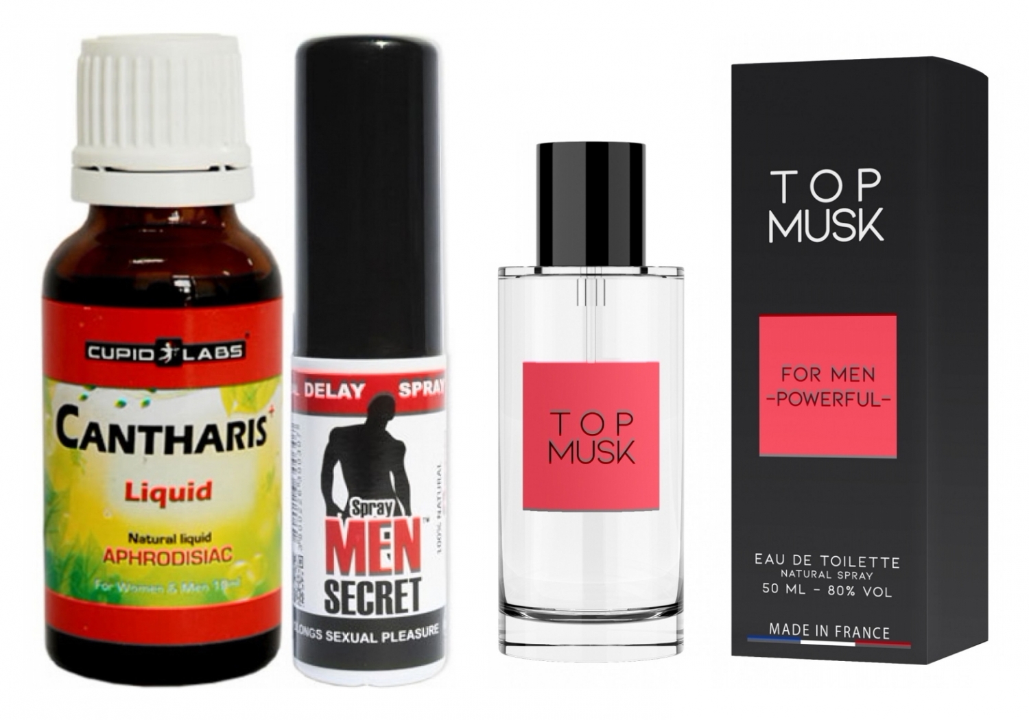 Cum se folosesc împreună: administrați 10–15 picături Cantharis Plus în orice lichid sau sub limbă cu aproximativ 30 de minute înainte pentru a stimula dorința și nivelul de energie. Numaidecât anterior intimității aplicați Men Secret conform prospectului pentru a reduce receptivitatea și a prelungi actul. Pulverizați Esența de Feromoni Top Musk ușor pe punctele calde (gât, încheieturi, piept) sau pe haine pentru a crea o aură irezistibilă. Respectați recomandările de utilizare: maxim 2 sesiuni cu Cantaridă în 24 de ore.