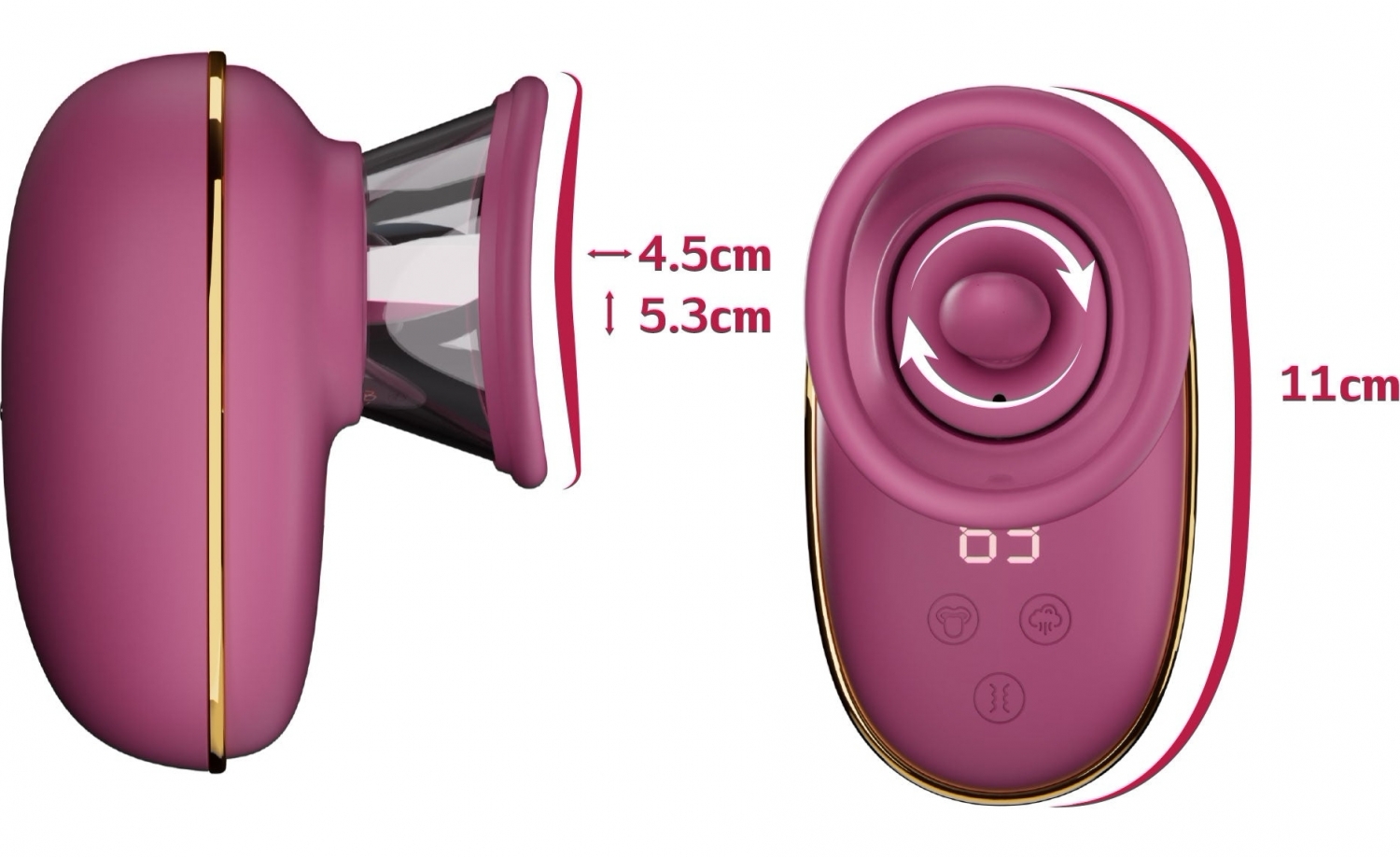 Alege dintre 9 moduri de rotație și vibrație și 3 nivele de vacuum pentru ajustare fină. Cupa de vacuum intensifică circulația locală, iar limba rotativă poate fi uzitată și independent, cu un acces mai adânc pentru stimulare concentrată.