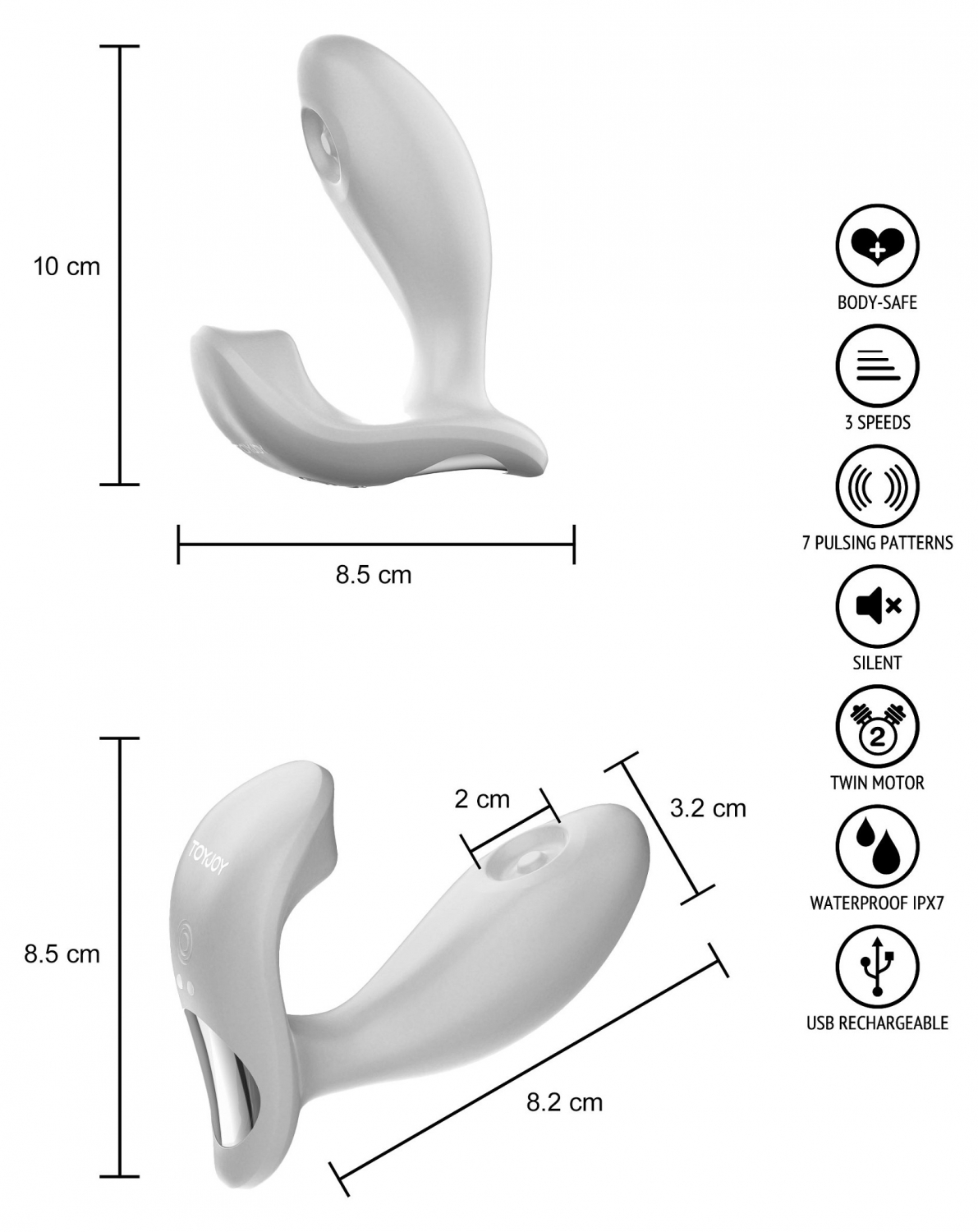 Produsul este reîncărcabil (acumulator Li‑ion) și dispune de două motoare care oferă pulsații diferențiate. Setările includ 10 moduri de vibrație (7 tipuri + 3 nivele de viteză) pentru ajustare fină. Carcasa din silicon combinat cu ABS conferă o senzație plăcută la atingere, iar protecția IPX7 permite utilizare în condiții umede și spălare facilă.