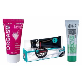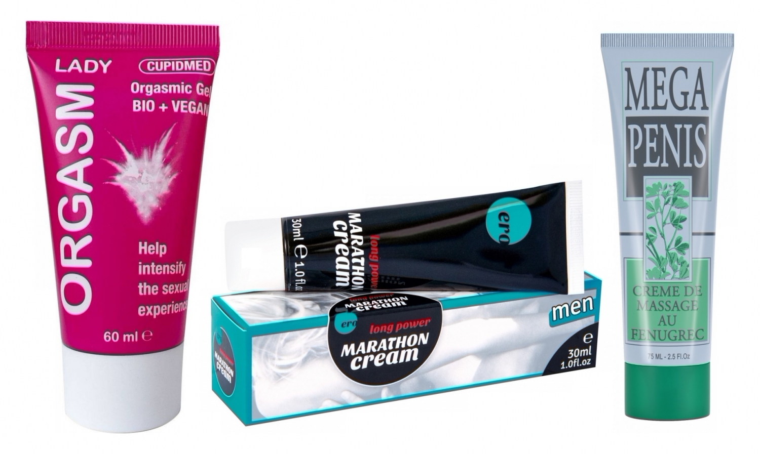 Cum le folosiți împreună: aplicați Gel Orgasm Lady pe zonele sensibile ale soției anterior preludiului pentru a intensifica senzațiile și senzația de încălzire; bărbatul aplică o cantitate mică din Crema Marathon pe penis și scrot cu circa 5 minute înainte de contact pentru a întinde erecția; crema Mega Falus se utilizează regulat, conform indicațiilor, pentru susținerea circulației și potențiala mărire în timp. Uzați prezervativul când este recomandat și testați pe o porțiune mică de piele în cazul în care stăpâniți epidermă sensibilă.