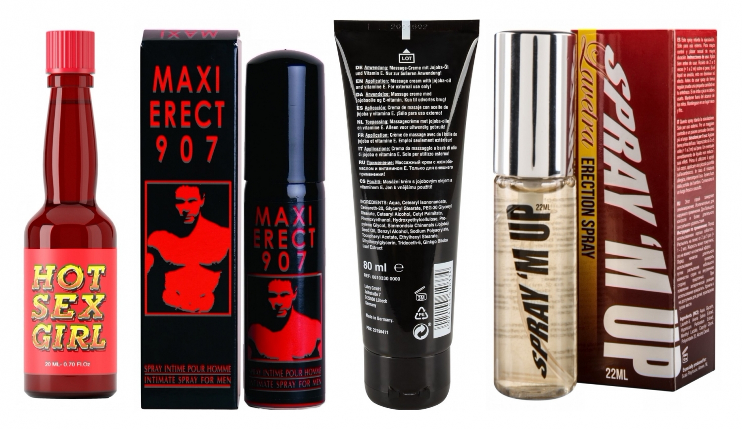 Detalii utile ale produselor: picăturile pentru ea conțin extracte din scorțișoară și măghiran, cunoscute pentru proprietățile lor tonice și stimulatoare, sprijinind la lubrifiere naturală; spray-urile masculinității includ ingrediente cu efect de încălzire și stimulare a circulației, pentru trăiri plăcute și erecții mai ferme; crema are ulei de jojoba, vitamina E și extras de ginkgo, punând la dispoziție hidratare, nutriție și susținere a fluxului de sânge local.