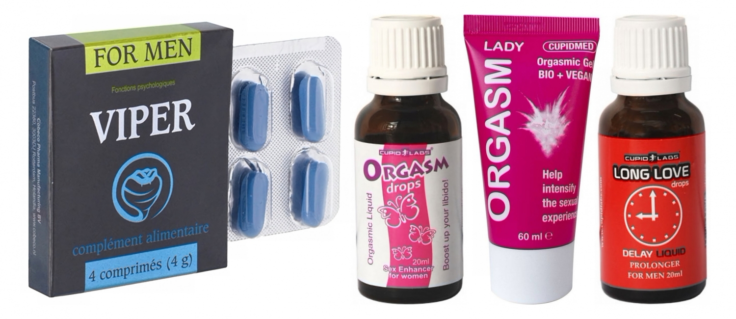 Pentru ea: Gel Plăcere sexuală maximă Lady 60 ml (Cupid Labs) — textură plăcută, hipoalergenic, fără parfum; aplicat pe zonele sensibile creează o senzație de încălzire și furnicături care amplifică excitarea. Picăturile Exuberant Drops 20 ml (Cupid Labs) sunt un afrodiziac oral pe bază de vegetale și vitamine; administrate cu aproape 30 de minute înainte, sporesc dorința și robustețea senzațiilor. Folosirea lor în tandem în timpul preludiului extinde receptivitatea și face atingerea mai electrizantă.