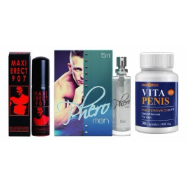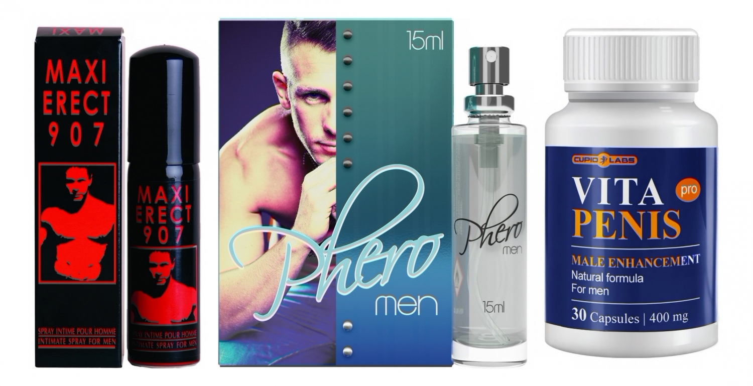 Un kit zămislit pentru bărbatul care vrea rezultate vizibile și senzații intense. Acest set combină un supliment pentru ajutorul capacității pe termen lung, un spray pentru fermitate imediată și un parfum cu feromoni care crește atracția — toate lucrând laolaltă pentru momente sexuale mai sigure și mai plăcute.