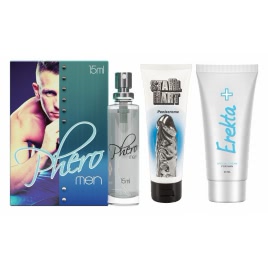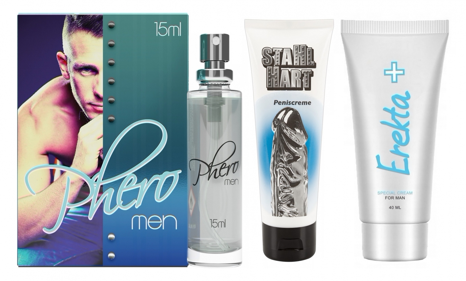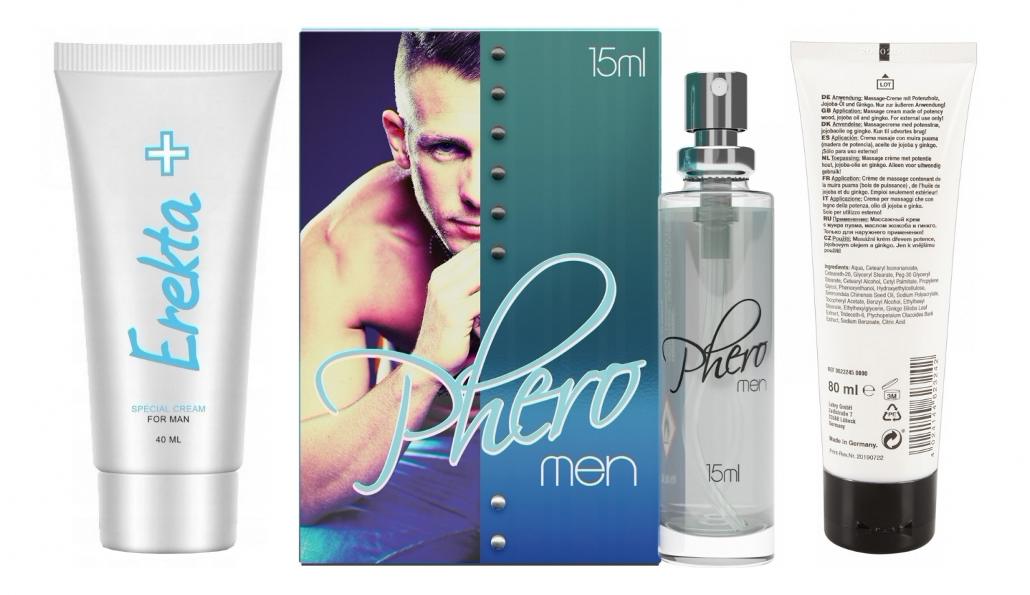 Descoperă combinaţia care îţi regăsește încrederea: parfumul cu hormoni de atracție îmbogățește atracţie și prezenţă, crema pentru erecții stimulează fermitatea și rezistenţa, iar crema de susţinere hrănește pielea și ajută circulaţia.