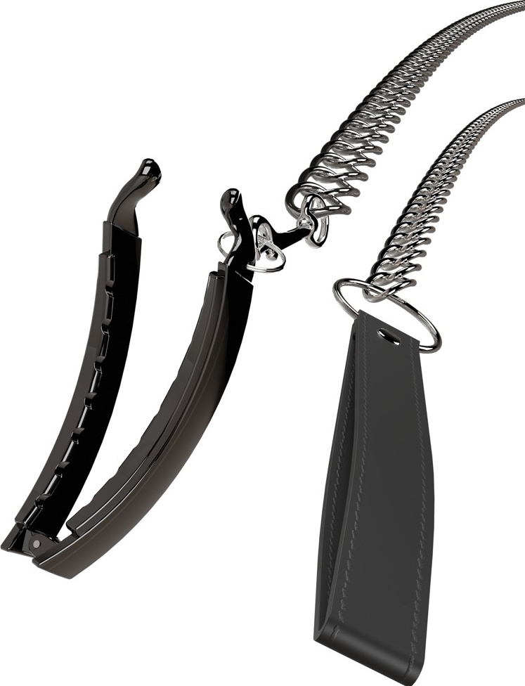 Lesa metalică lungă se atașează rapid la inelul clemei printr-un cârlig snap și poate fi detașată pentru flexibilitate în utilizare. Extindere lesa: 85.5 cm; cingătoare de încheietură: 16.4 cm. Mânerul din imitație de piele oferă control suplimentar în momentul manevrării.