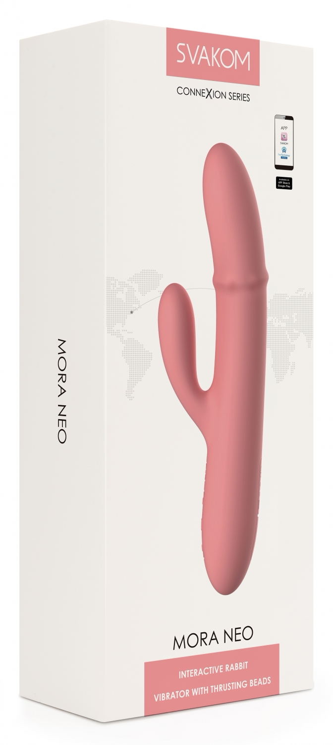 Mora Neo de la Svakom este un vibrator tip rabbit din Liquid Silicone cu suprafaţă catifelată, conceput pentru stârnire combinată: tijă semi-rigidă cu inel interior cu perle care se deplasează ritmic şi un stimulator pentru clitoris independent. Estetică ergonomic, uşor de întreţinut.