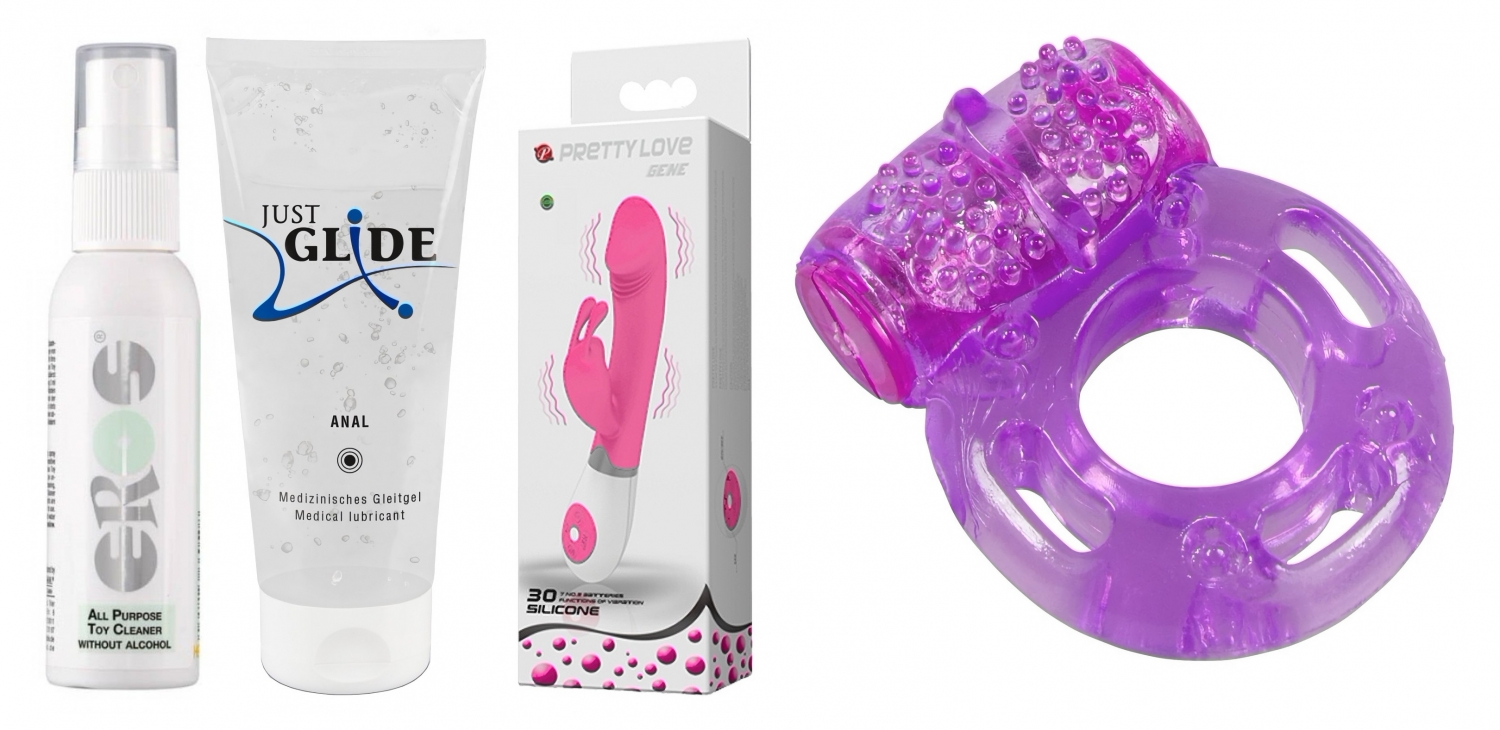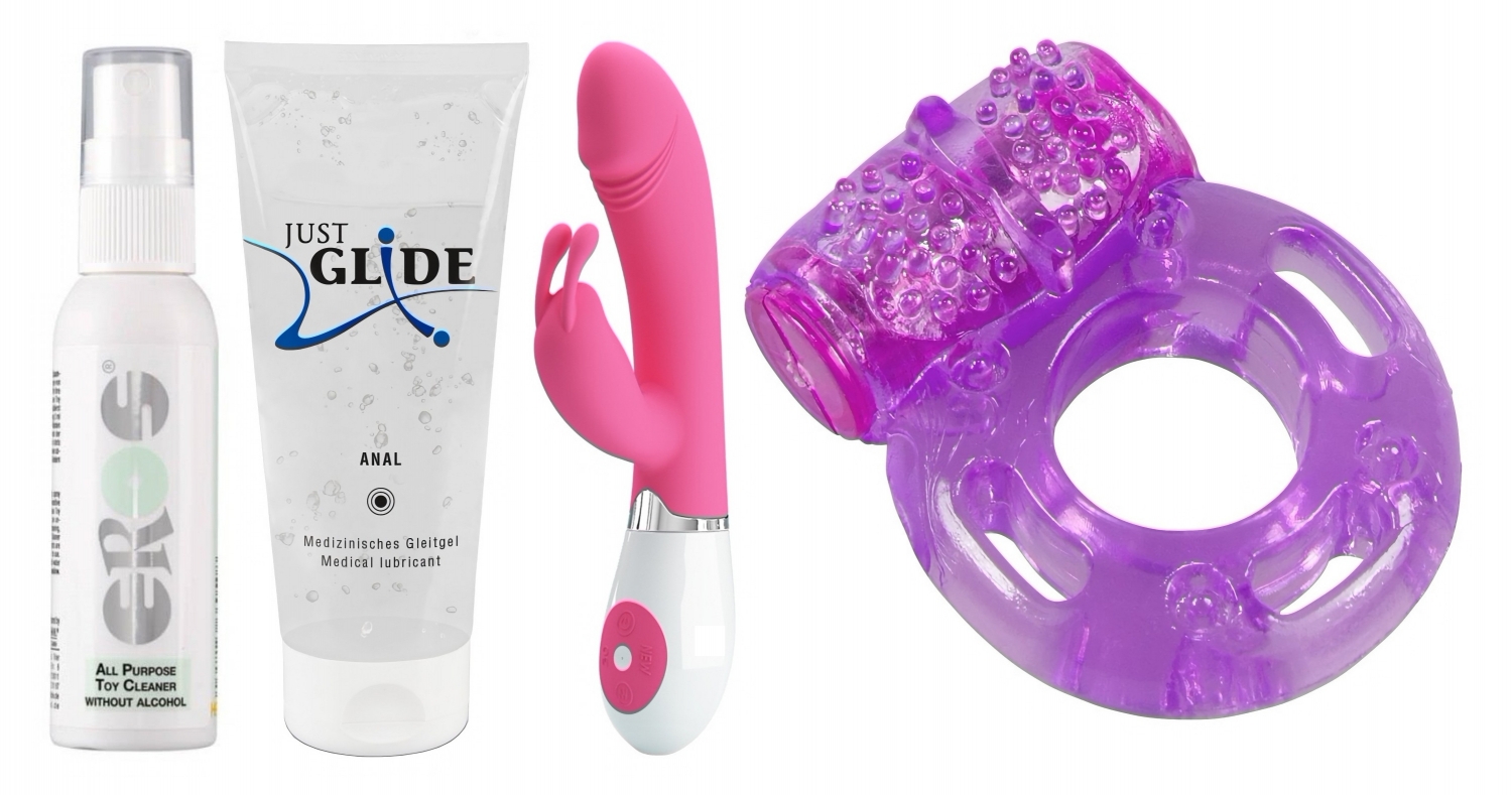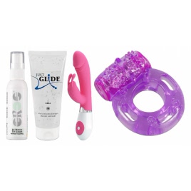 Cum se folosesc împreună: Începeți prin igienizarea jucăriilor cu spray-ul minus alcool; aplicarea unei cantități generoase de agent de ungere anal asigură o glidare lină pentru explorările anale. Inelul vibrator se aplică la baza penisului pentru a menține o sculare mai fermă și pentru a aduce vibrații directe spre parteneră, iar vibratorul rabbit poate fi întrebuințat simultan pentru stârnire externă și internă, intensificând feelingurile și preludiul.