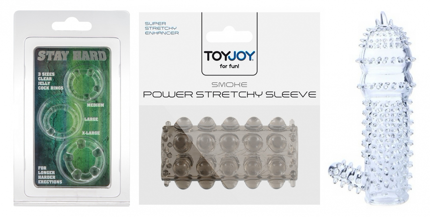 Manșon Power Stretchy (TPE, negru) acordă o prindere elastică care îmbunătățește rigiditatea și rezistența, cu o textură fină ce asigură stimulare suplimentară. Manșonul transparent din silicon, mai lung și cu proeminențe exterioare, alcătuie senzații tactilo-vizuale care intensifică contactul și apropierea. Kitul de inele (3 mărimi din TPR/ABS) îngăduie ajustare progresivă: poți testa diametrul care se potrivește cel mai bine, le poți folosi la bază sau pe testicule pentru variații de senzație și control asupra actului ejaculării. Toate sunt rezistente la apă, ușor de purificat și durabile.