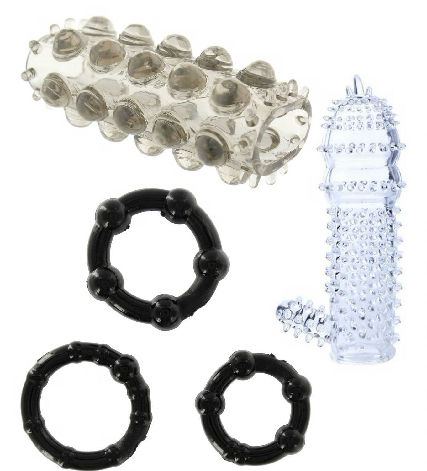 Transformă indiferent ce întâlnire într-o practică mai intensă cu acest set combinabil. Folosește unul dintre inele la baza penisului pentru a ajută erecția, apoi aplică manșonul potrivit: cel transparent cu striații adaugă frecare și incită partenera, iar varianta neagră compactă oferă o fixare fermă și confort.