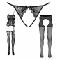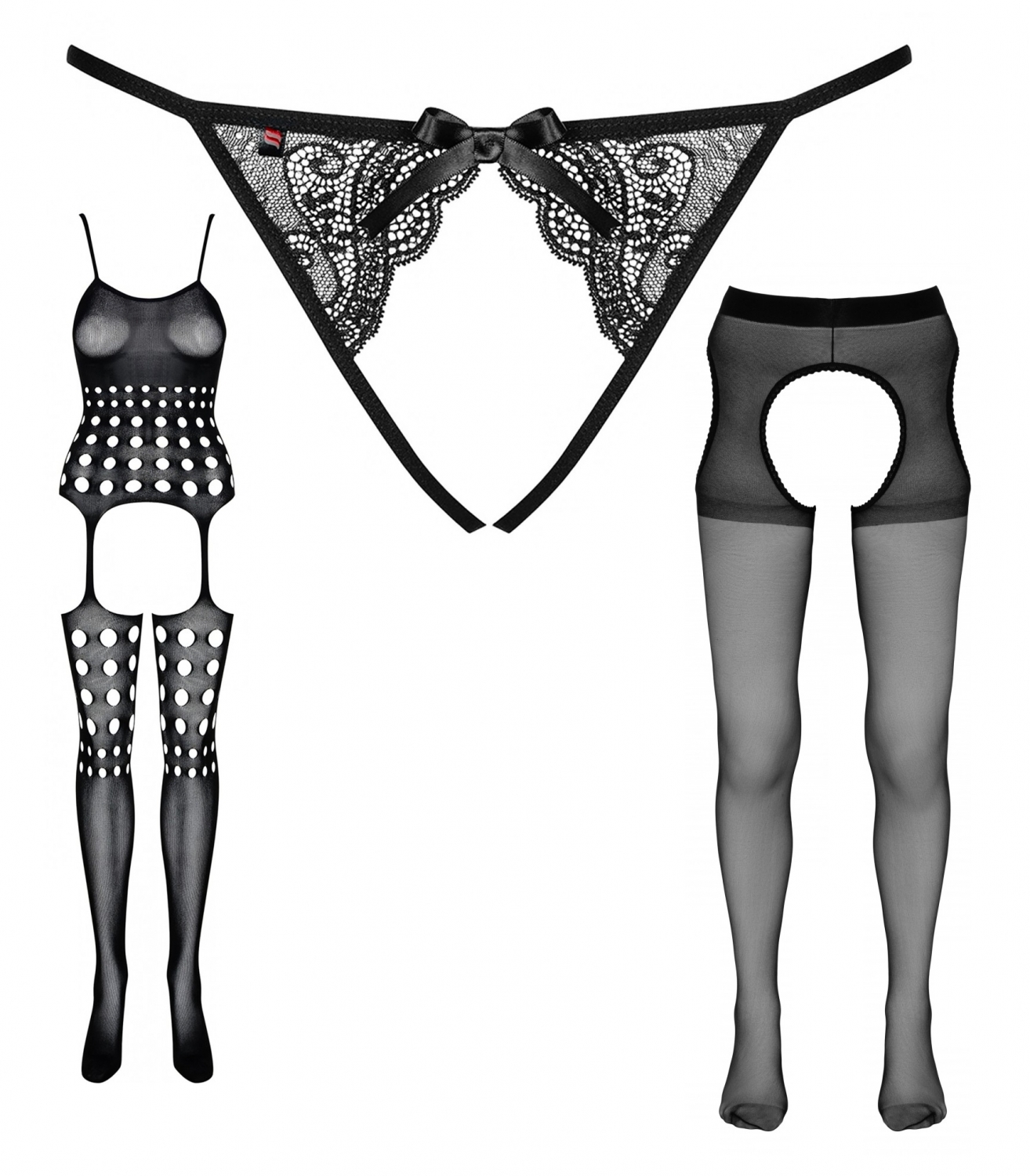 Acest set combină trei componente concepute să amplifice atracția și să prezintă libertate în jocul intim. Poartă bodystocking-ul pentru a stabili atmosfera: materialul elastic urmează linia corpului iar decupajele lasă loc imaginației. Ciorapii cu decupaj completează ținuta și îndreaptă atenția înspre picioare, iar chiloțeii deschiși furnizează acces repede fără a strica suspansul.