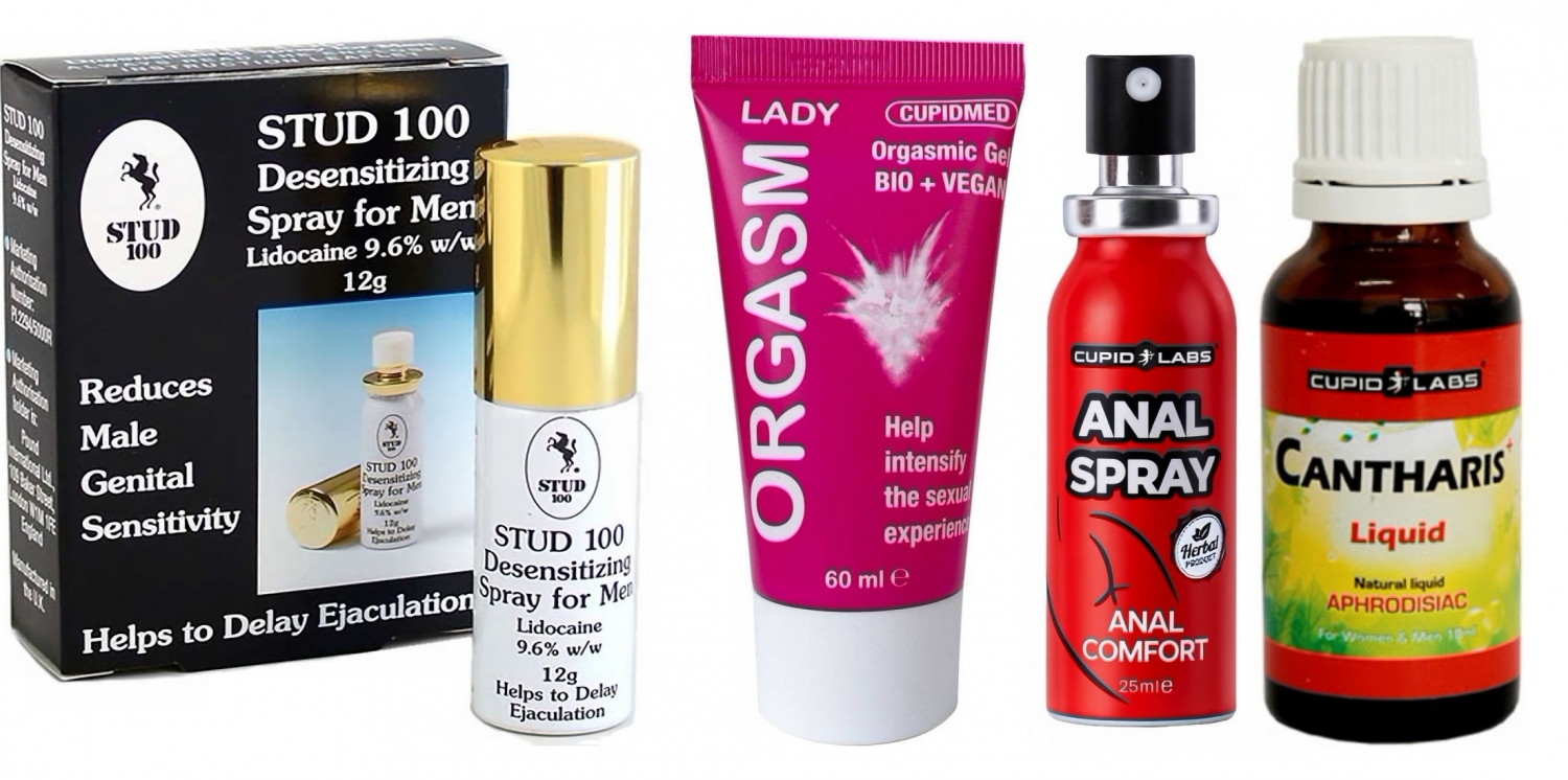 - Atomizator Stud 100 (12 g): restrânge receptivitatea local pentru a întinde actul; efect în ~5 minute; dozaj inițial 2–3 pulverizări, până la 10 la nevoie; recipientul conferă multe aplicări; recomandat spălat înainte de atingere pentru a evita anestezia partenerului sau uzați prezervativ.