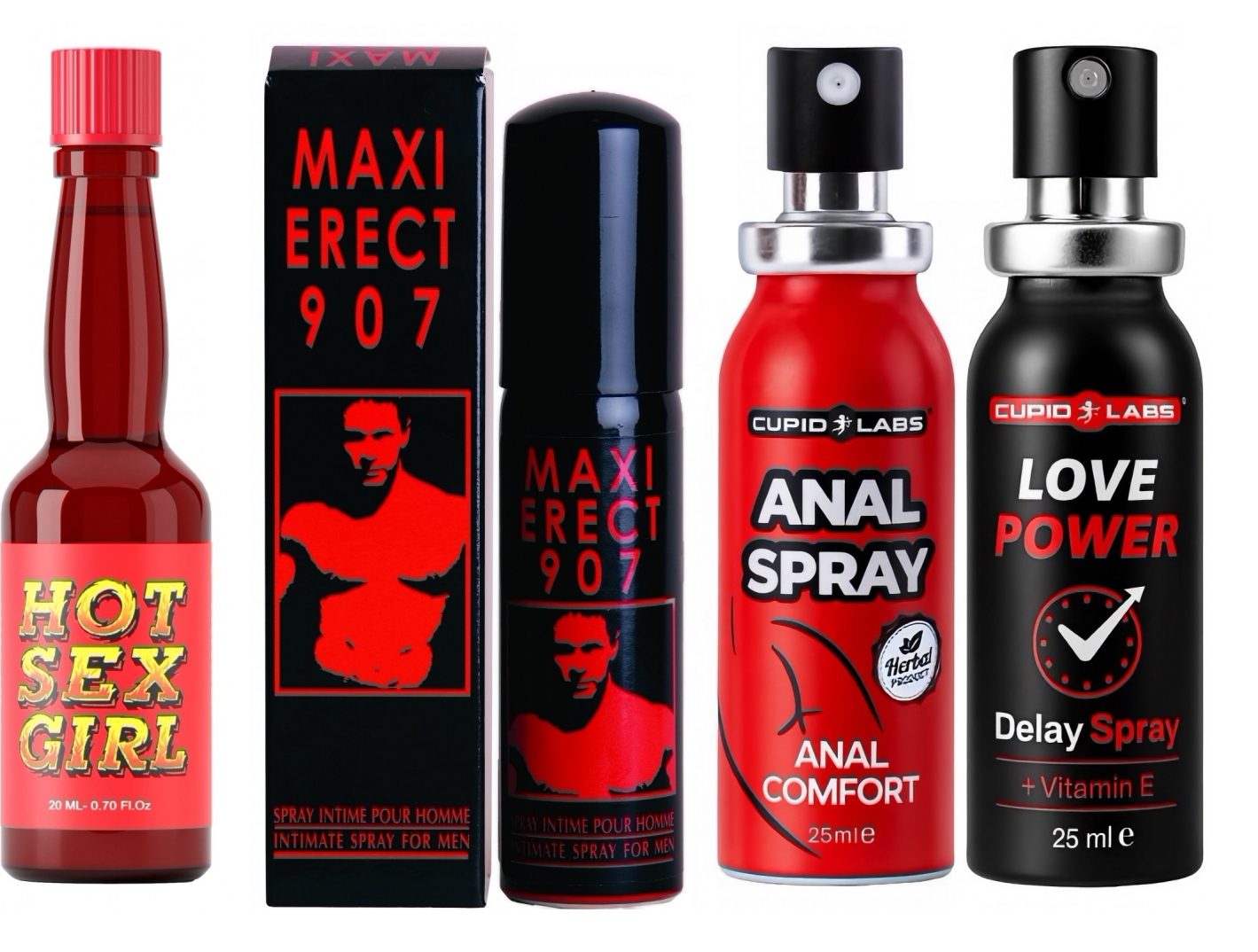 Detalii utile despre produse: Love Power Delay (25 ml, Cupid Labs) ponderează sensibilitatea lezne și rapid; Spray Desensibilizator Anal (25 ml, Cupid Labs) relaxează zona și ajută penetrarea; Afrodiziac Extaz (20 ml, Ruf) conține componente naturale pentru mărirea libidoului și hidratare; Maxi Sculare 907 (25 ml) incită circulația locală și prinde fermitatea. Respectați recomandările de utilizare: testați receptivitatea pe o suprafață mică înainte de întâia utilizare și lăsați produselor câteva minute să acționeze.