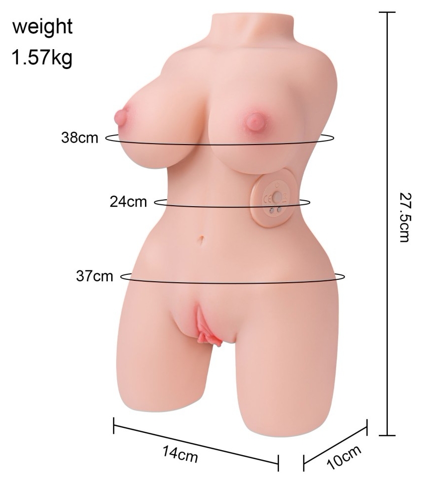 Dimensiuni conform declarației producătorului: înălțime 27,5 cm; lățime 14 cm; circumferințe: bust 38 cm, șold 37 cm, talie 24 cm; greutate declarată 157 kg.