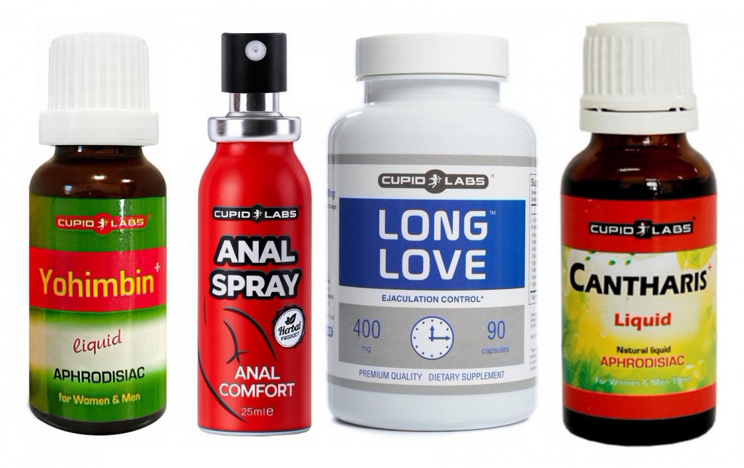 - Afrodisiac Yohimbin Drops (20 ml): extract concentrat ce favorizează circulația și vigilența senzorială; 15–20 picături dizolvate în apă cu 30 de minute înainte de act pot susține erecția și mărirea intensității la cele două sexe.