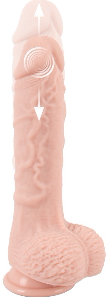 Sub testicule se află o ventuză largă și puternică care garantează stabilizare stabilă pe suprafețe netede — ideal pentru poziții hands-free. Telecomanda radio permite control la distanță (până la 5 m), fiind utilă atât pentru utilizator, cât și pentru un partener.