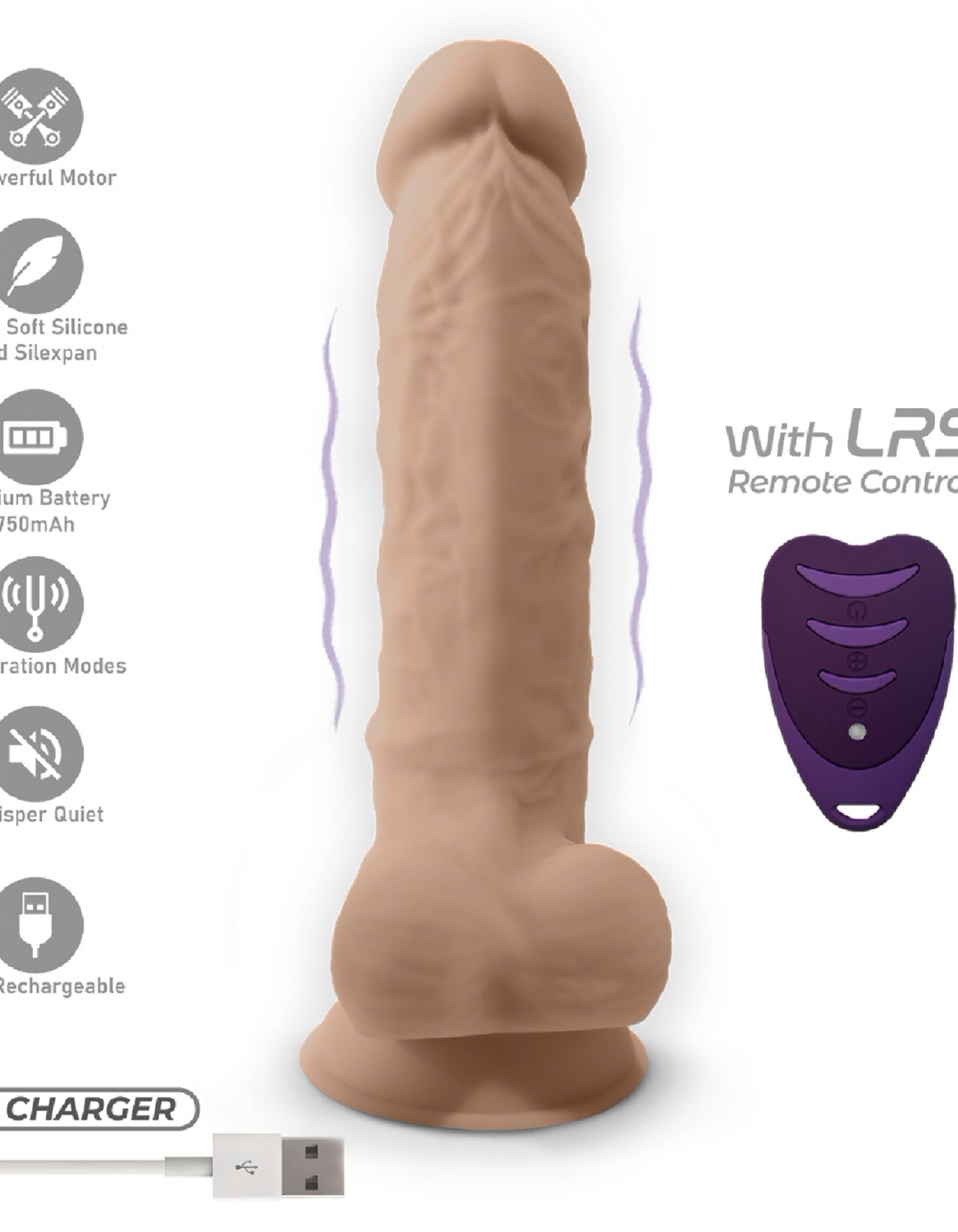 Control intuitiv: tele-comandă cu sistem LRS și 10 feluri de vibrație fără greutate de comutat. Dispozitivul este reîncărcabil prin cablu USB; telecomanda conține baterie CR2032. Autonomie până la 180 minute la o încărcare.