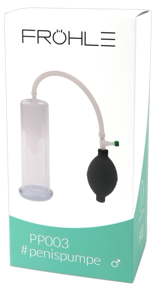 PP003 de la Frohle este o pompă manuală pentru penis, construită din materiale transparente și ample (PC, PVC). Sistemul cu bilă de pompare, tub și supapă compune un vid controlat de până la 250 mbar, punând la dispoziție o suctiune intensă pentru susținerea rigidității.