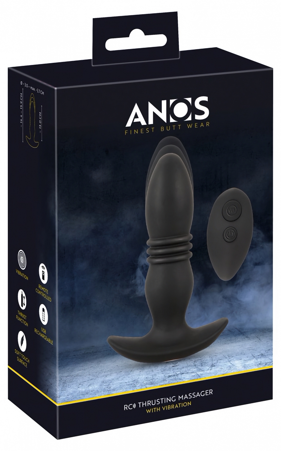 Plug vibrator ANOS cu funcţie de împingere, creat pentru stârnire anală precisă. Combină 10 moduri de vibraţie şi 6 chipuri de împingere, controlabile separat — direct de pe mecanism sau prin telecomandă cu rază până la 5 m.
