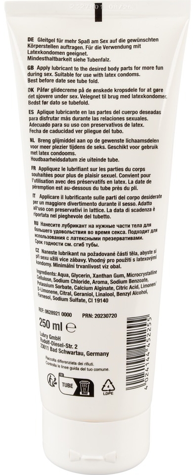 Poate fi folosit ca agent de ungere sau ca element realist în producții private sau profesionale, inclusiv pentru filmări sau videochat. Potrivit cu prezervative din latex. Fără uleiuri, ceea ce ajută curățarea și nu lasă reziduuri grase.