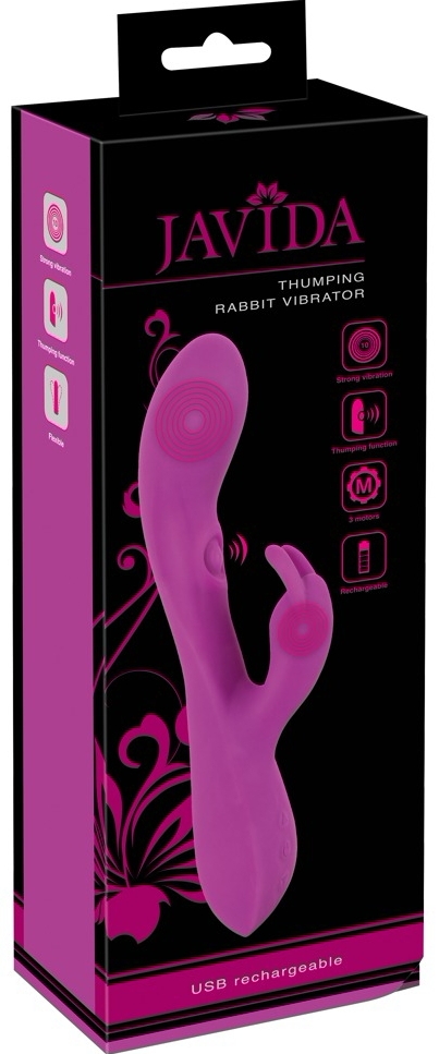 JAVIDA Thumping Rabbit combină un vârf curbat pentru punctul G cu un braț flexibil pentru surescitarea externă a clitorisului. Trei motoare separate oferă control precis al intensității și ritmului.