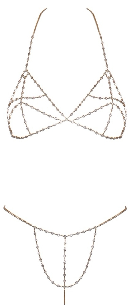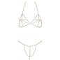 Set Cottelli Collection din lanțuri aurii, format din sutien și tanga acoperite cu ștrasuri strălucitoare. Lanțurile metalice dă un rezultat elegant și pun în valoare linia bustului și zona intimă.