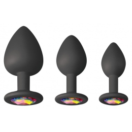 Set rafinat de trei dopuri anale din silicon, finisate atent și decorate cu o stâncă multicoloră care reflectă lumina. Forma ergonomică și suprafața delicată propune o inserare blândă și confort pe durata purtării.