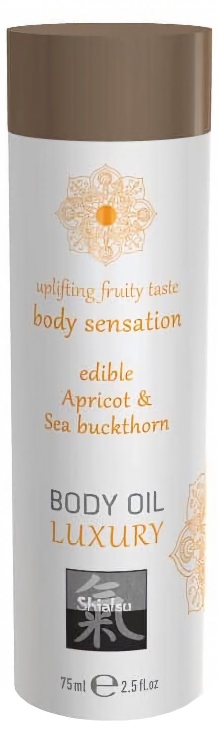 Shiatsu Luxury este un ulei de frecție comestibil, 75 ml, cu aromă gingașă de caise și cătină. Formula pe bază de uleiuri normale oferă o textură lejeră, alunecoasă și o senzație moale la atingere.