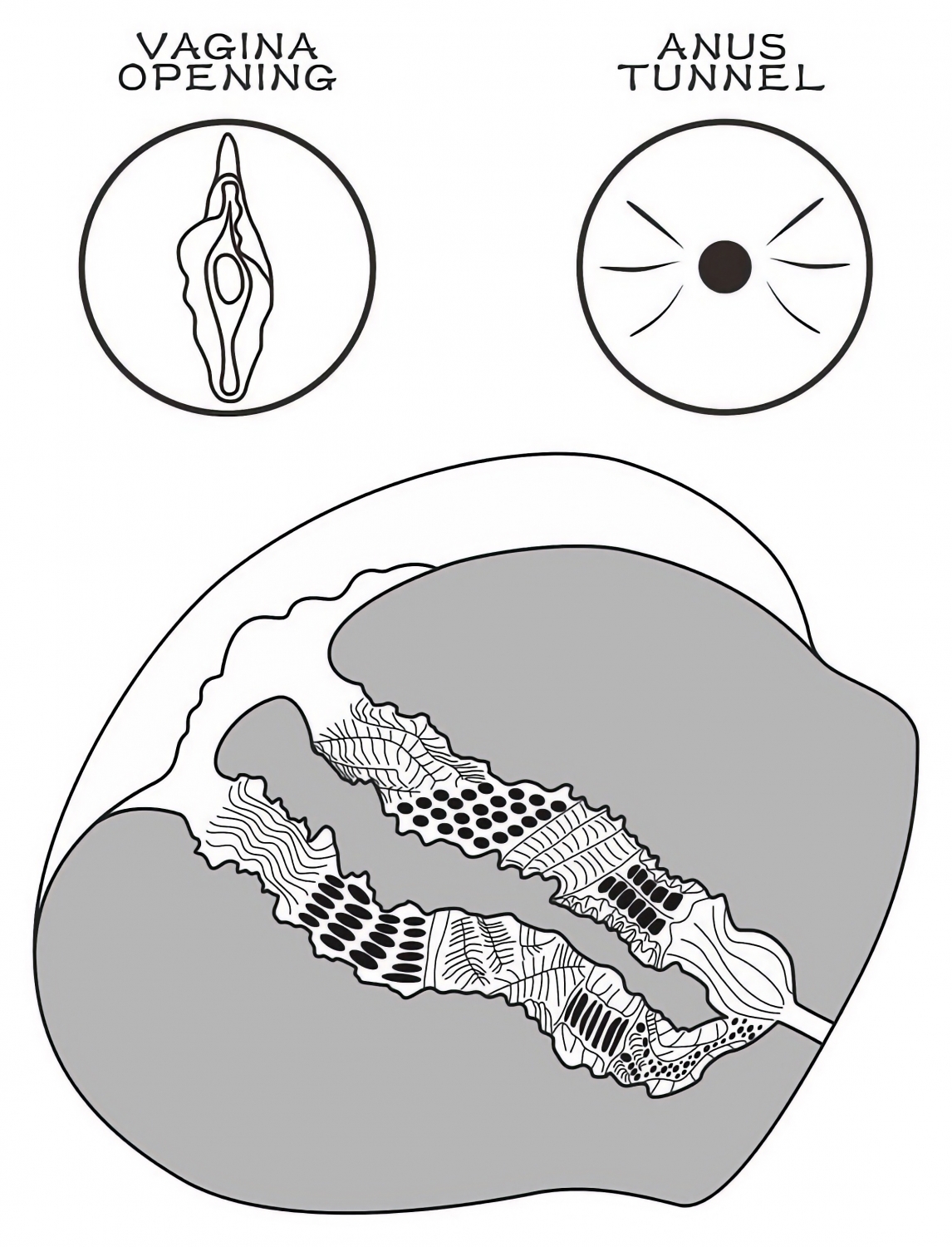 Interiorul conferă două canale distincte pentru variație: un canal mai strâns, cu curbe pentru senzații concentrate, și un canal cu striații pentru frecări diferite. Suprafețele sunt netede și proiectate pentru confort.