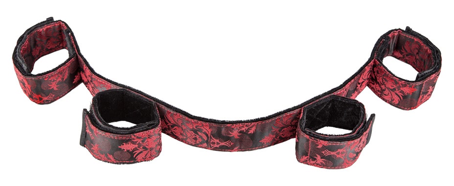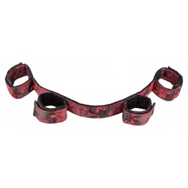 Curea despărțitoare ajustabilă la încheieturi și la glezne. Conține o parte plușată pentru confort și o parte cu tip pe material. Se prinde cu arici. Patru manșete de lux sunt conectate la o bară de design flexibilă pentru a lega strâns încheieturile și gleznele în poziții delicate expuse. Predați-vă oricărui capriciu al iubitului vostru.