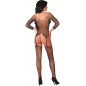 Bodystocking cu formă de corset și portjartier, ce lasă descoperită zona inghinală. Catsuit de tentă neagră, cu model, ce creează iluzia optică a unui top cu cingătoare și ciorapi atașate. Materialul se mulează perfect pe corp, alungind și subțiind silueta. Bunul este fabricat dintr-un material flexibil si se potriveste marimilor S, M si L.