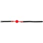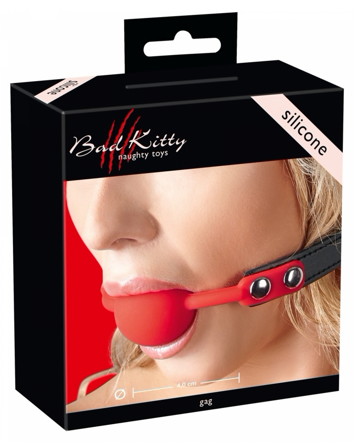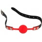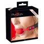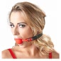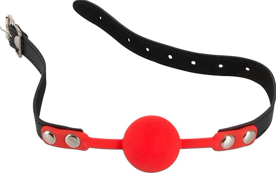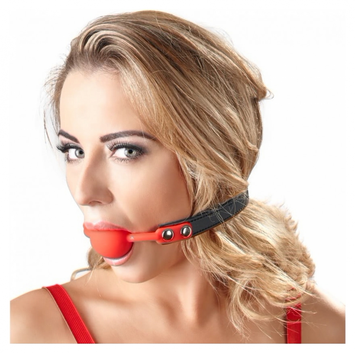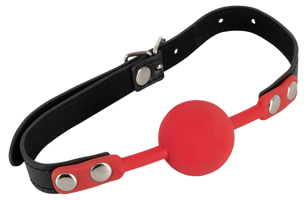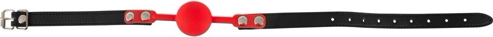 Căluș din silicon roșu alipit unei curele din imitație de piele neagră reglabilă, cu patru orificii și o cataramă.
