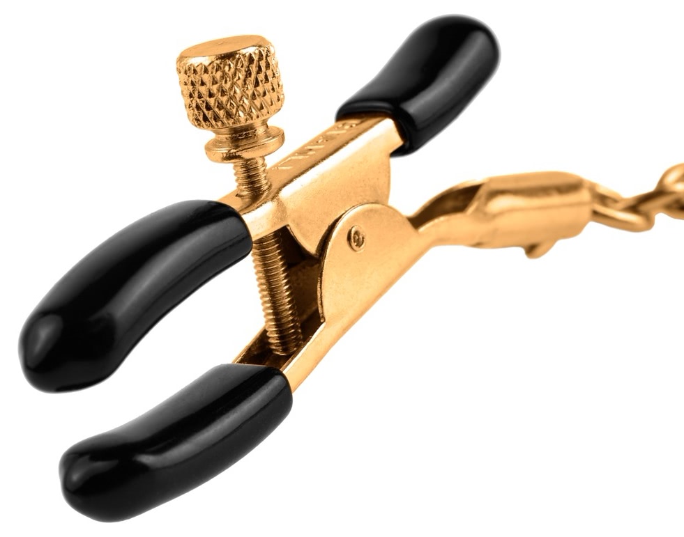 Clemele pentru Sfârcuri Fetish Fantezie Gold sunt create pentru plăcerea ei și pentru utopiile lui. Acoperite cu garnituri din latex moale, pentru luxul dumneavoastră, clemele, sunt perfecte pentru începători. Cantitatea de presiune care este aplicată sfârcurilor, este reglabilă, se rotește șurubul până la poziția dorită, lăsați clemele să vă stimuleze sfârcurile pentru o senzație incredibilă!
