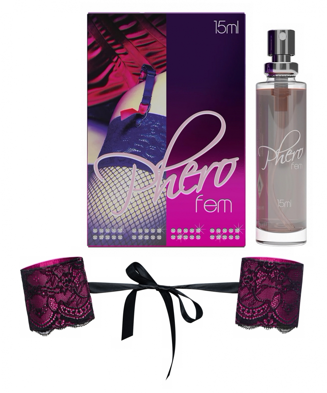 Descriere Pachet Parfum Feromoni PheroFem 15ml + Cătușe Obsessive Roseberry Mov Roz: